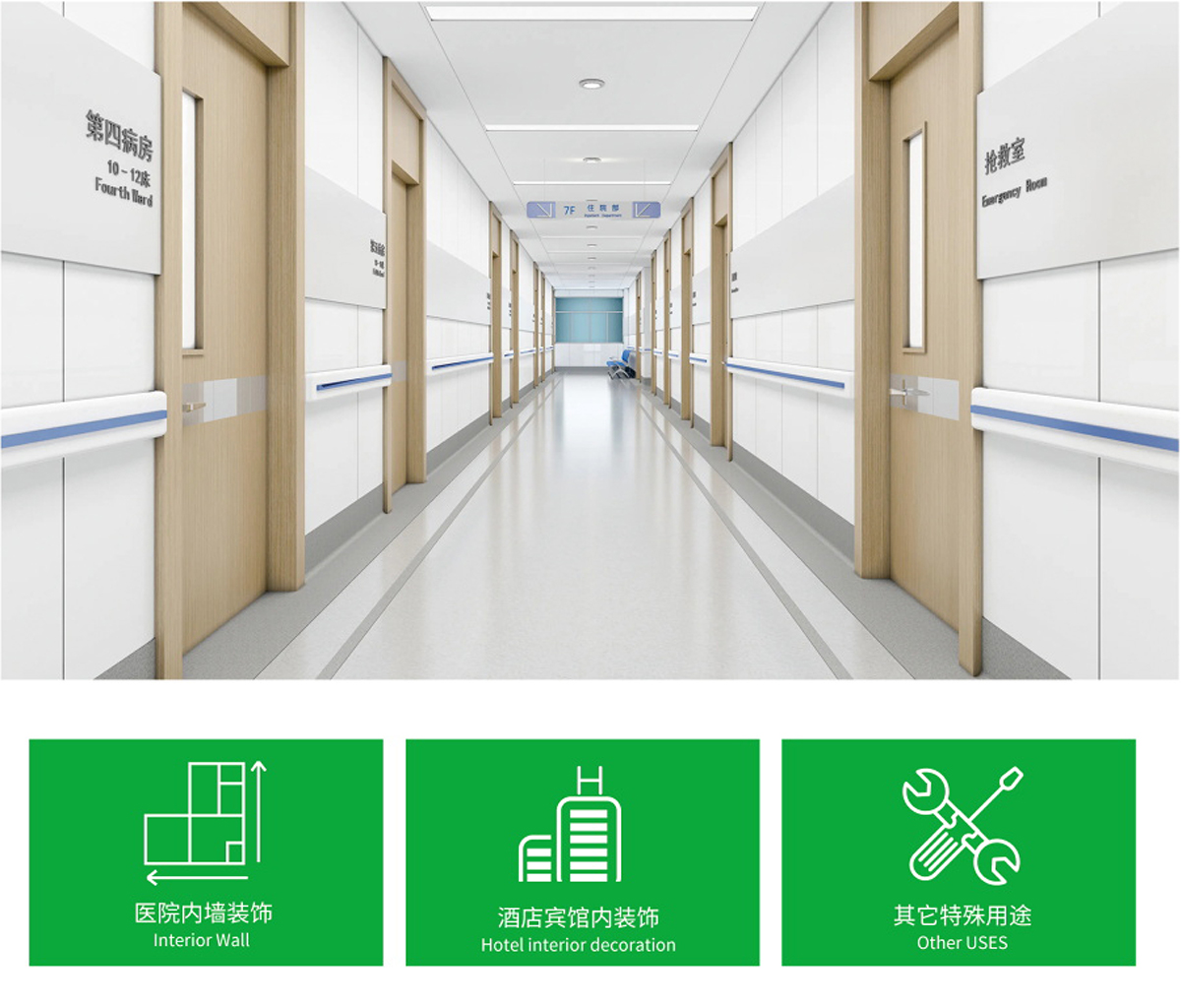 醫(yī)療潔凈板也稱無機預(yù)涂板、潔凈板,以100%無石棉的高密度硅酸鈣板為基材,用UV漆作為原料,利用UV光固化工藝對板材表面進行涂裝裝飾。在板材表面附上UV油漆涂層,通過紫外光的照射,瞬間固化成膜,且固化含量高、硬度大,板面平整光滑,具有良好的抗菌能力。UV潔凈色板,主要用于醫(yī)療潔凈室、手術(shù)室、ICU病房和通道走廊的墻面裝飾。